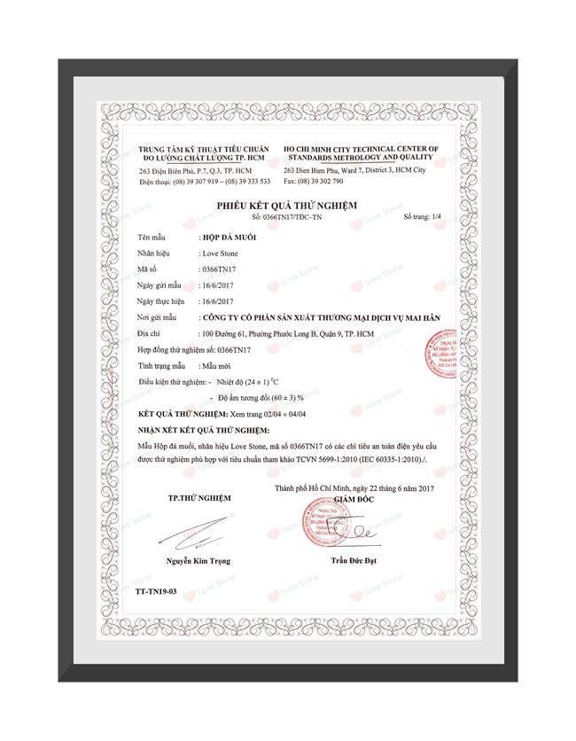- Đạt chỉ tiêu An toàn điện của TT Kỹ thuật Tiêu Chuẩn Đo lường Chất lượng TPHCM.