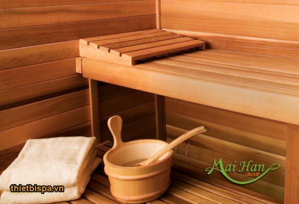 Phòng xông hơi với các phụ kiện như khăn, xô gáo gỗ thông