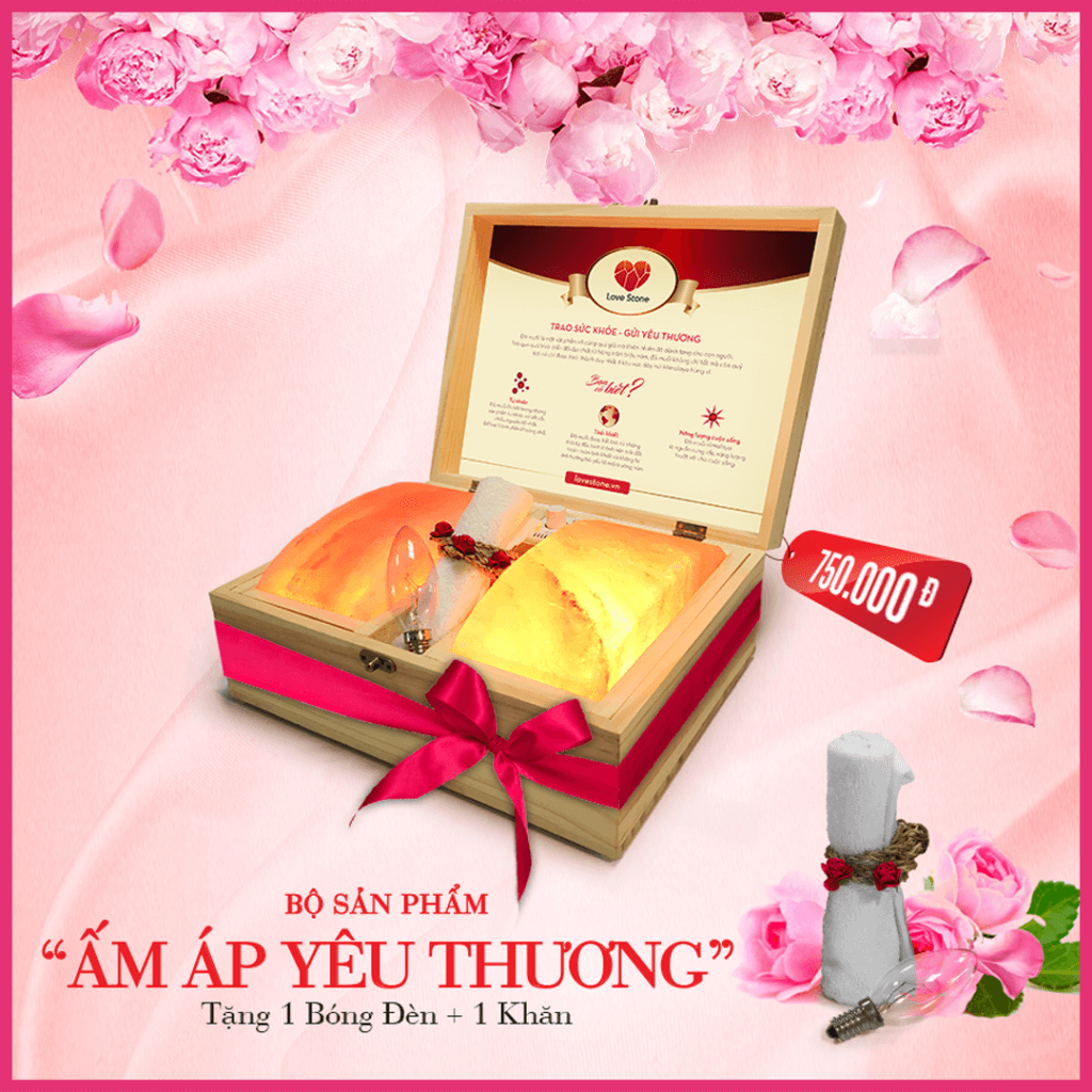 Bộ sản phẩm “Ấm áp yêu thương”: Khi mua 01 hộp đá muối massage chân Love Stone Magic, quý khách hàng sẽ được tặng 01 khăn + 01 bóng đèn.