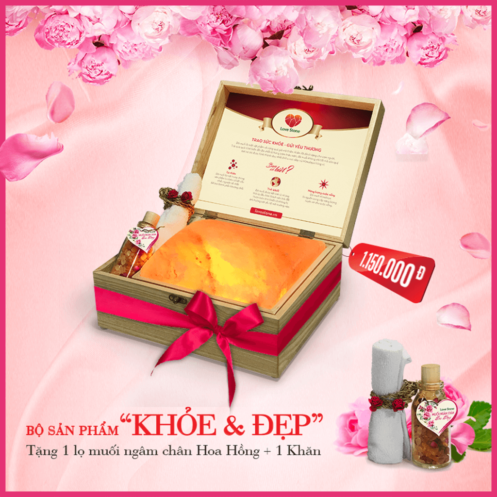 Bộ sản phẩm “Khỏe & đẹp”: Khi mua 01 hộp đá muối massage chân Love Stone Deluxe, quý khách hàng sẽ được tặng 01 khăn + 01 chai muối ngâm chân hoa hồng (200g).