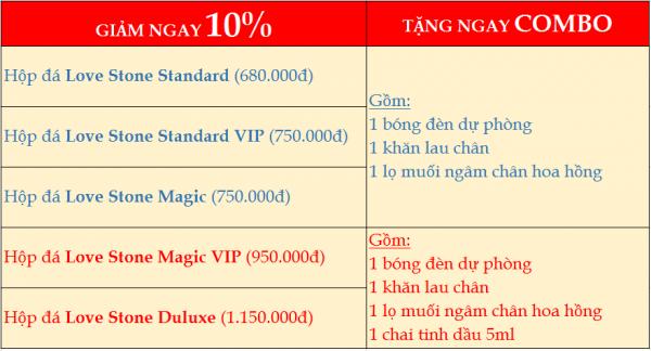 ♦ Khi mua bất kì sản phẩm hộp đá muối massage chân Love Stone bên dưới từ ngày 01-07-2018 đến 31-07-2018 sẽ được giảm giá ngay 10% và tặng thêm combo quà tặng hấp dẫn chưa từng có trước đây.
